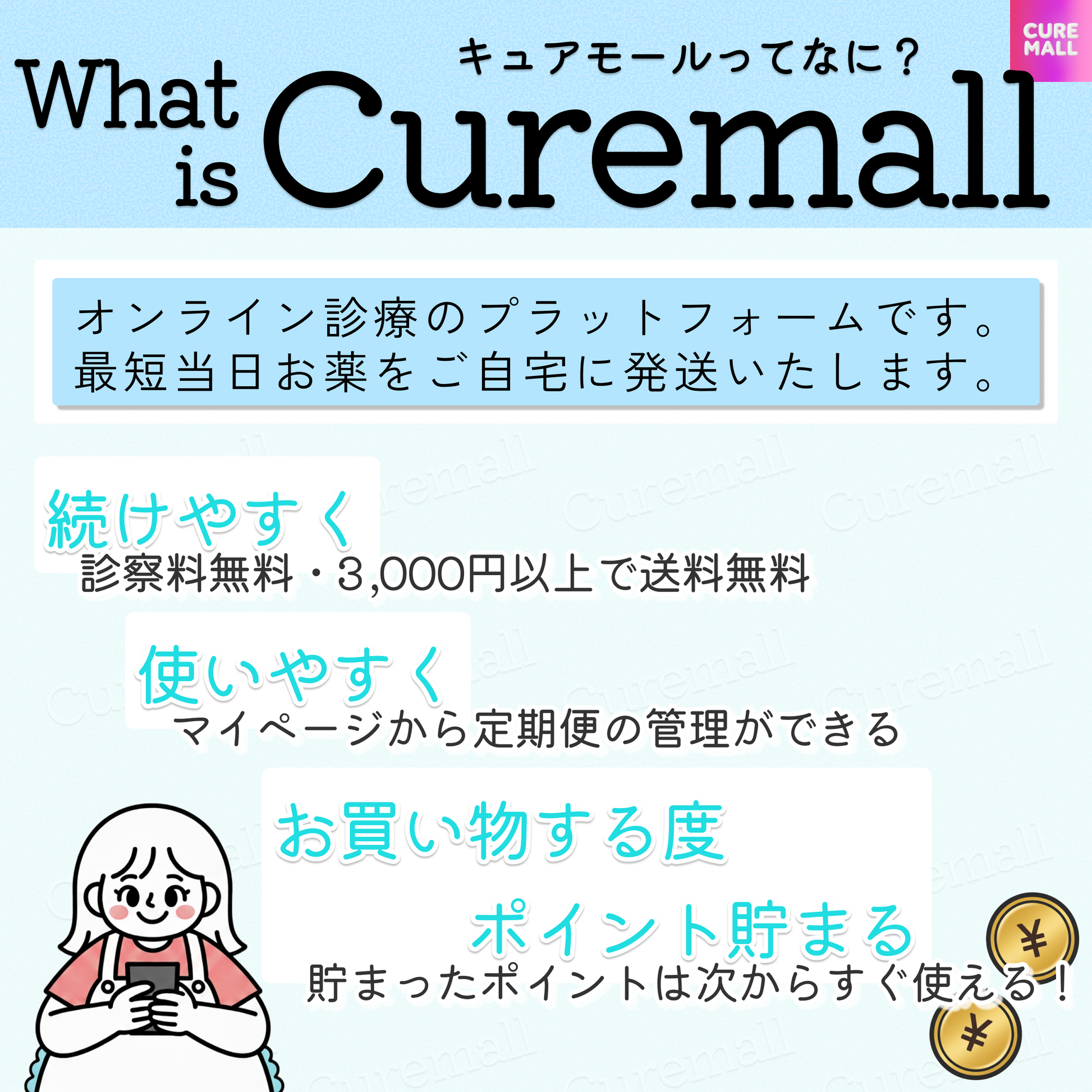 決済方法 Curemall では、クレジットカード(VISA・MasterCard・AMEX・JCB・Discover・Apple Pay)、銀行振込に対応しております。なお、Curemall がお客様の決済情報を保持することはございませんので、安心してご利用ください。